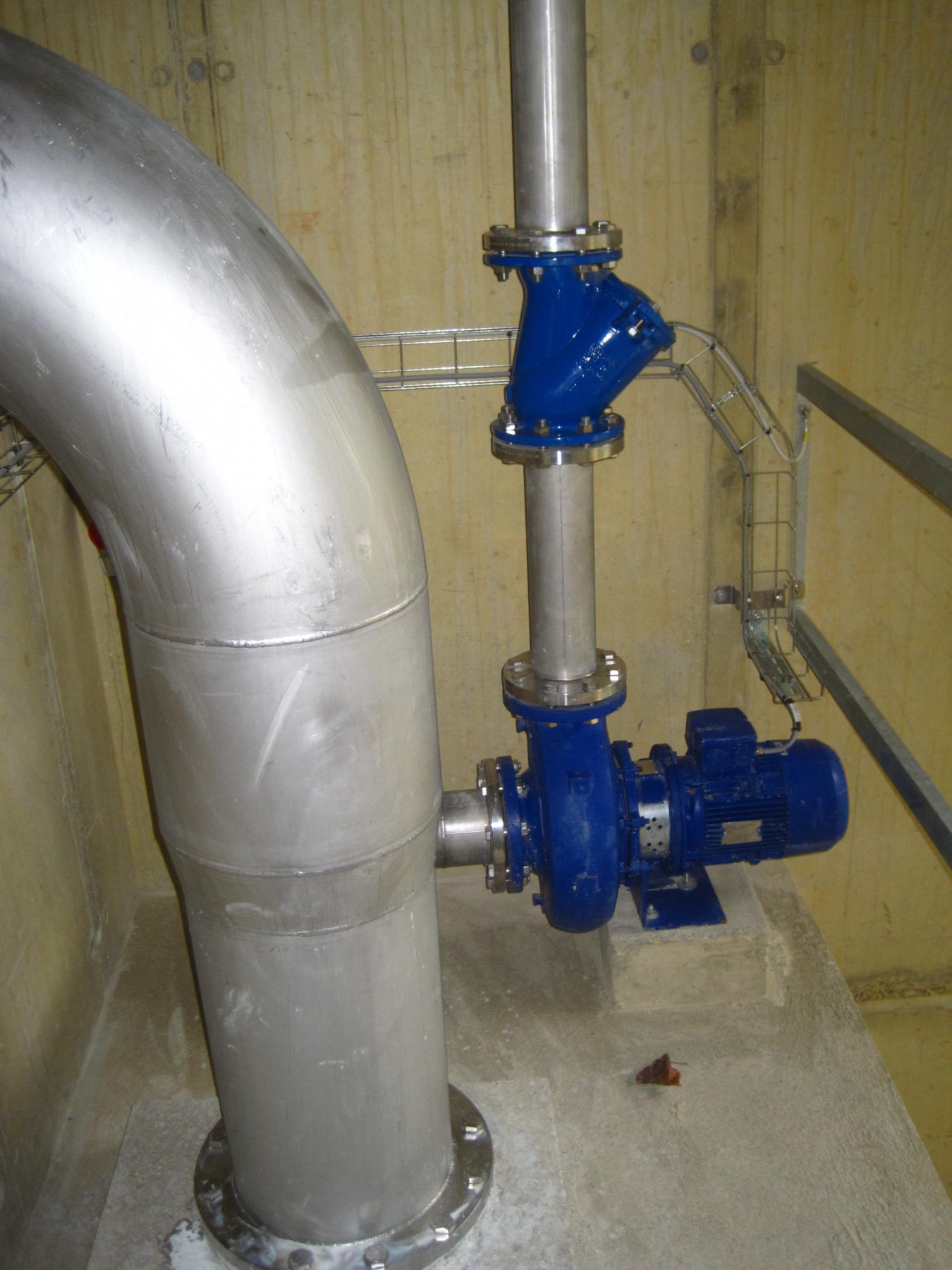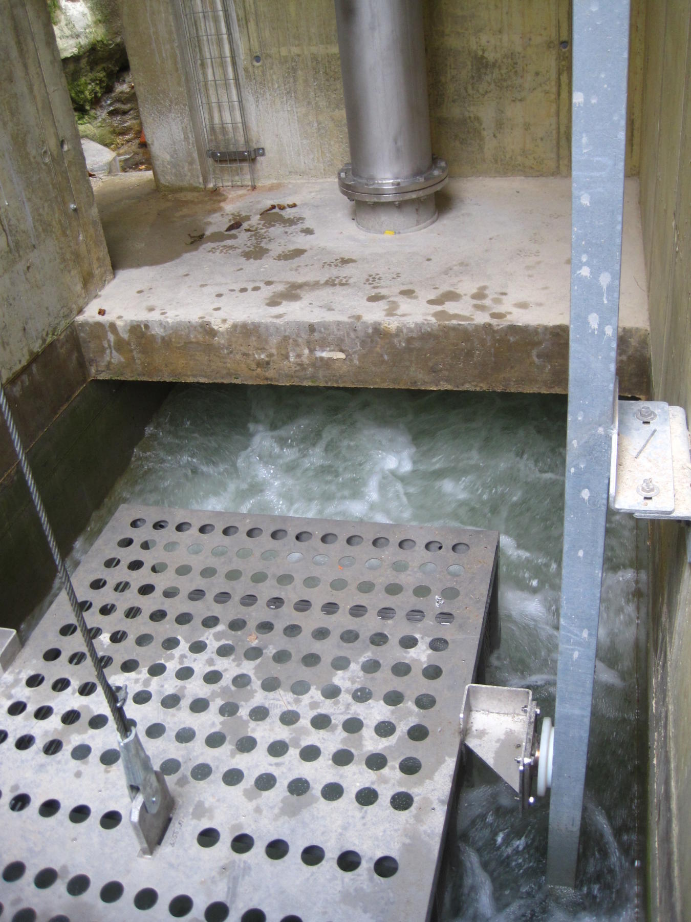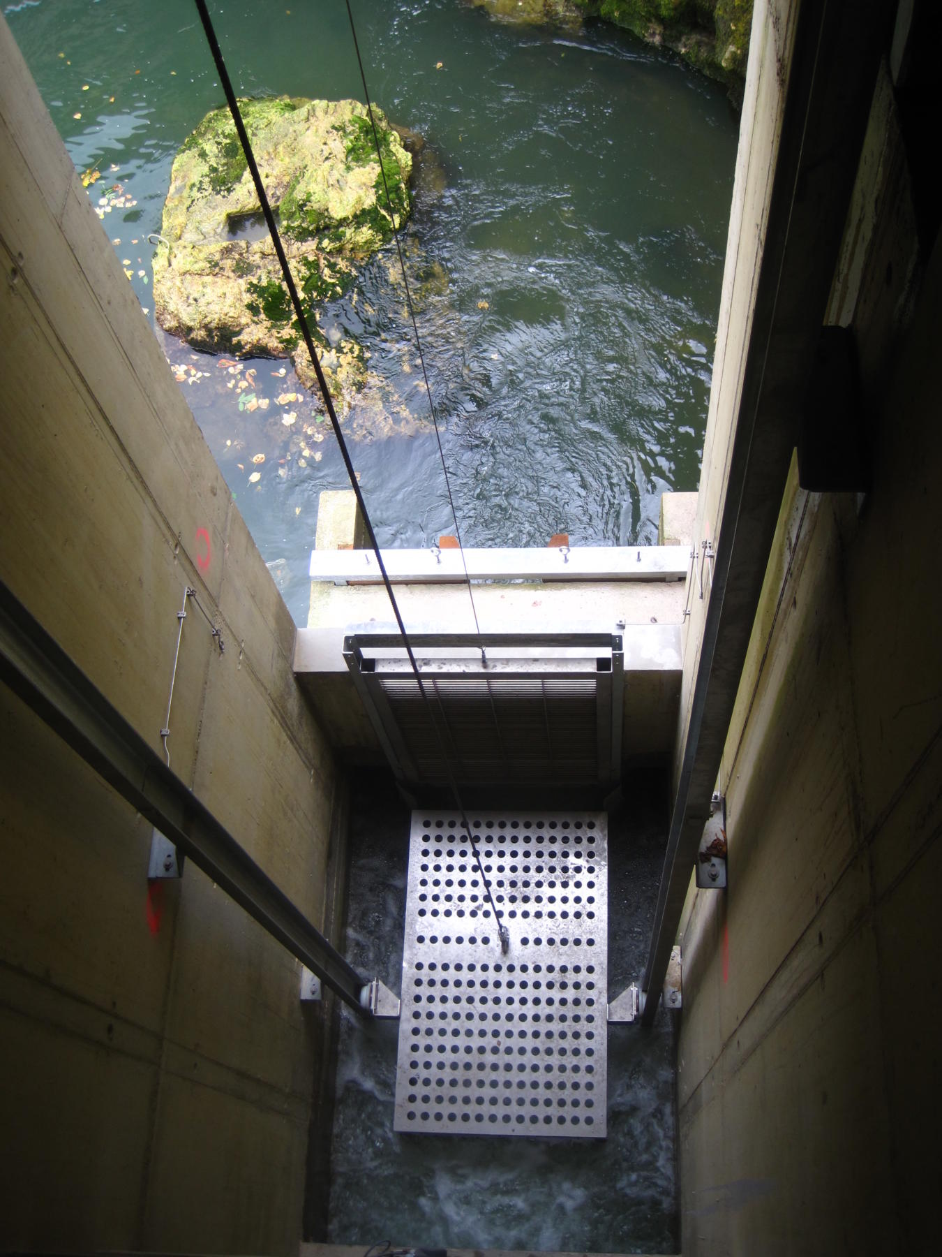 Le principe d’un tel ouvrage est relativement simple : en plaçant l’ascenseur à l’endroit même où les poissons s’accumulent au pied du barrage, ceux-ci sont attirés à l’aide d’un débit d’attrait de l’ordre de 350 l/s, amené par une conduite Inox DN350 depuis la retenue jusqu’à l’ascenseur. Pour que le courant d’attrait produit soit suffisant (avec une vitesse de l’ordre de 1,5m/s), une ouverture de taille réduite est disposée à l’entrée de l’ascenseur.