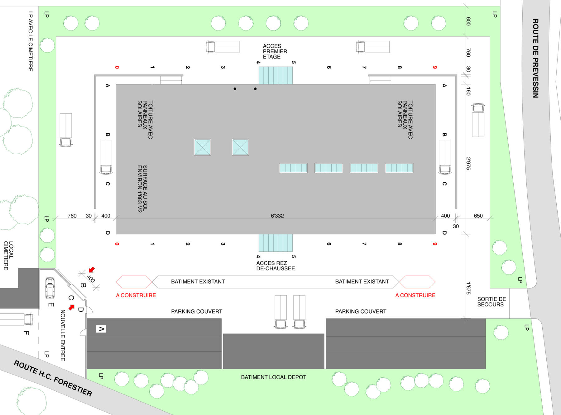 Le bâtiment actuel comprend un rez-de-chaussée et un étage accessible depuis l’arrière du bâtiment. Sa structure est constituée par des cadres en béton armé contreventés par les façades. Les dalles sont préfabriquées avec des poutres en BA et des corps-creux. Une variante de démolition et reconstruction du bâtiment à neuf a été proposée et acceptée en remplacement de la transformation lourde avec création d’un étage supplémentaire proposée dans l’étude de faisabilité.