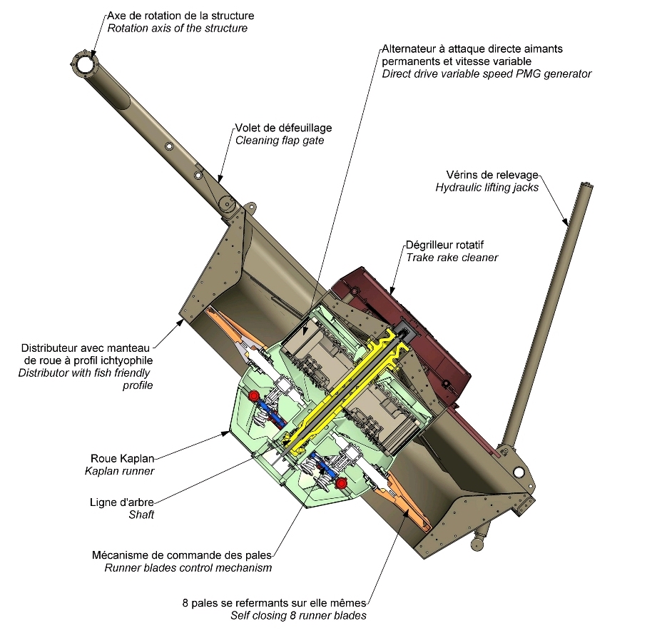 Le nouvel aménagement «barrage-usine» comprend six passes dont quatre sont équipées de turbines de type VLH et les deux restantes de vannes de fond utilisées pour le transit des matériaux charriés. La partie supérieure des six passes, conçue pour être déversante, est équipée de bouchures gonflables.