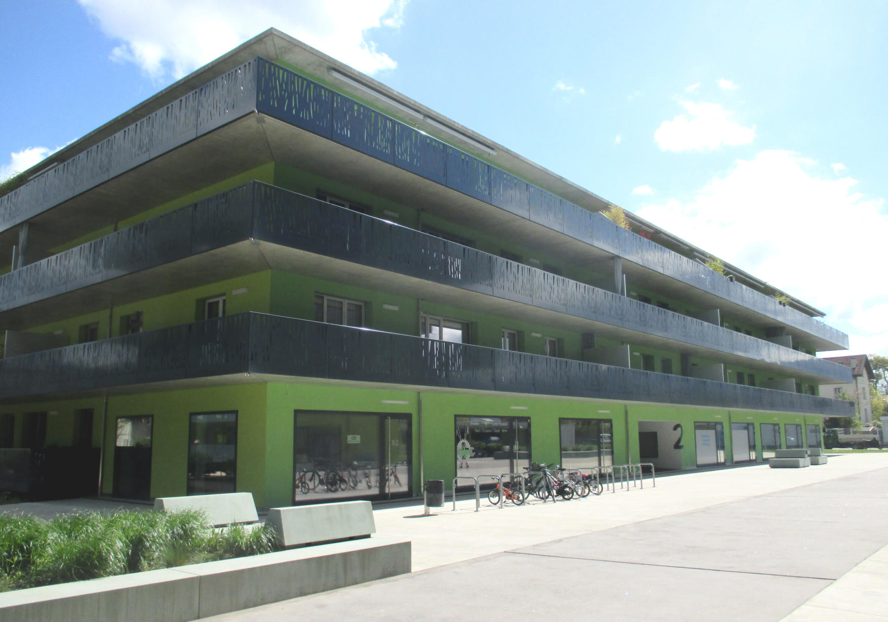 Le Bâtiment E, Immeuble PPE, de deux étages sur rez plus attique et deux niveaux de sous sol comporte 44 logements de 3 à 6 pièces et 514 m² de surface commerciale. L’ouvrage se compose de dalles plates de 1’800 m² de surface pour 22cm d’épaisseur, reposant sur une trame de colonnes et murs. L’ensemble recouvre partiellement le parking commun de deux nivaux de sous-sol. L’ensemble de la structure porteuse du bâtiment est en béton armé.