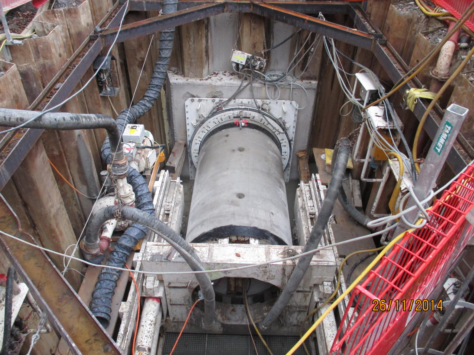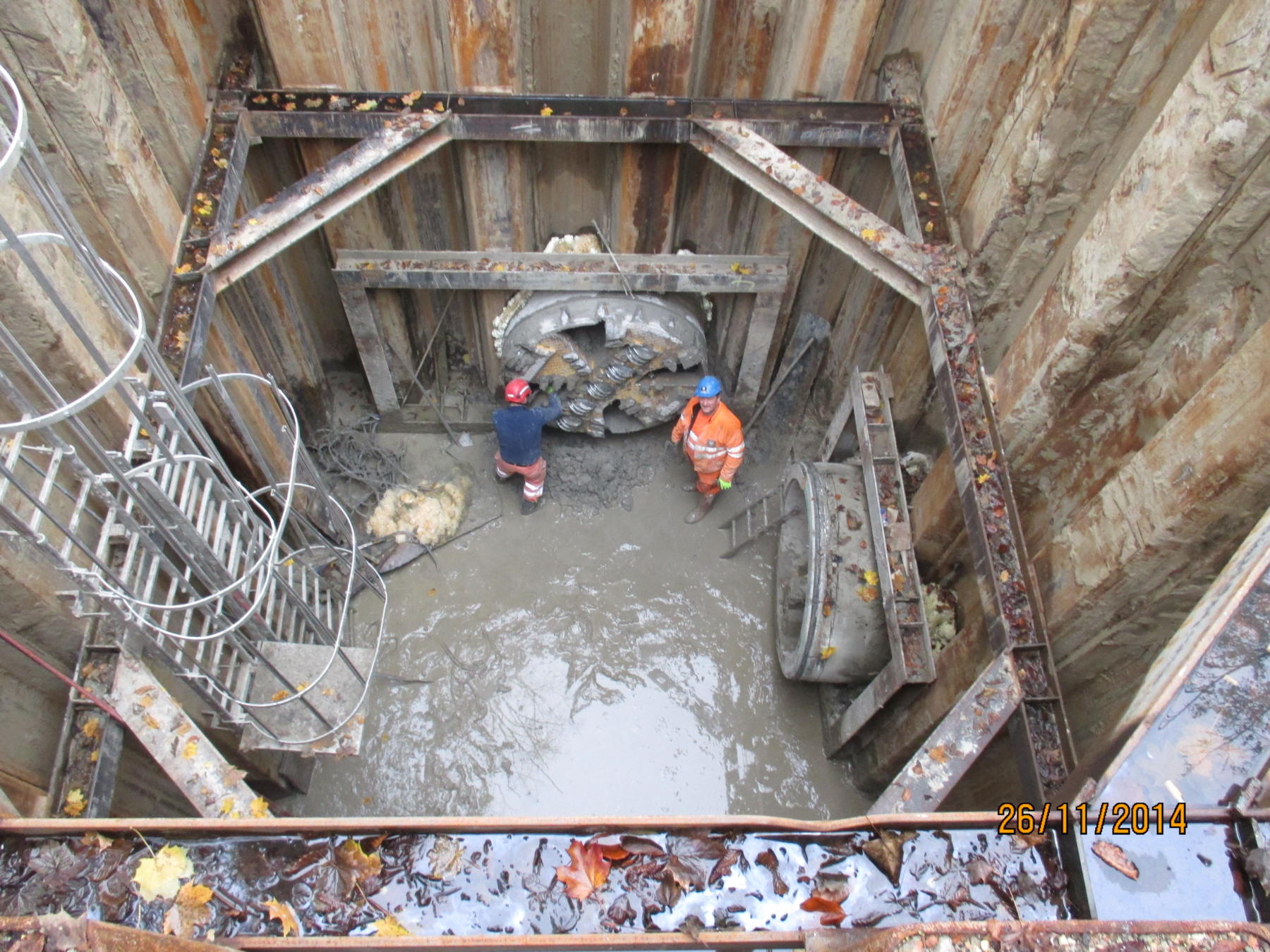 - Fonçage hydraulique du collecteur Ø1500 au microtunnelier : 250ml (premier tir) ; 165ml (second tir en courbe, rayon de courbure 1500m).