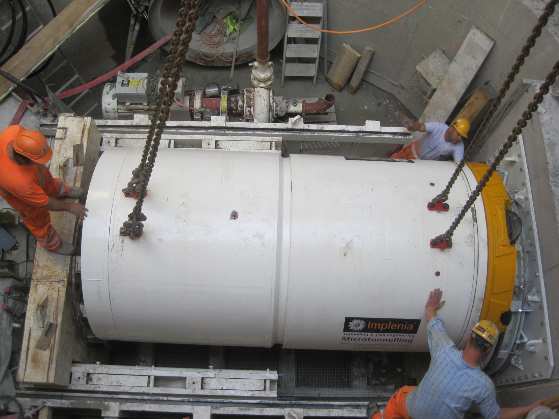 Compte-tenu de la profondeur importante du collecteur (de 4 à 9 mètres de profondeur) et de la présence de terrains de mauvaise qualité sous nappe phréatique superficielle (limons et argiles peu consolidés voire fluents), l’étude du projet a abouti à l’adoption d’une méthode d’excavation sans tranchée, soit l’utilisation d’un microtunnelier avec maintien de la tête de confinement par pression bentonitique.