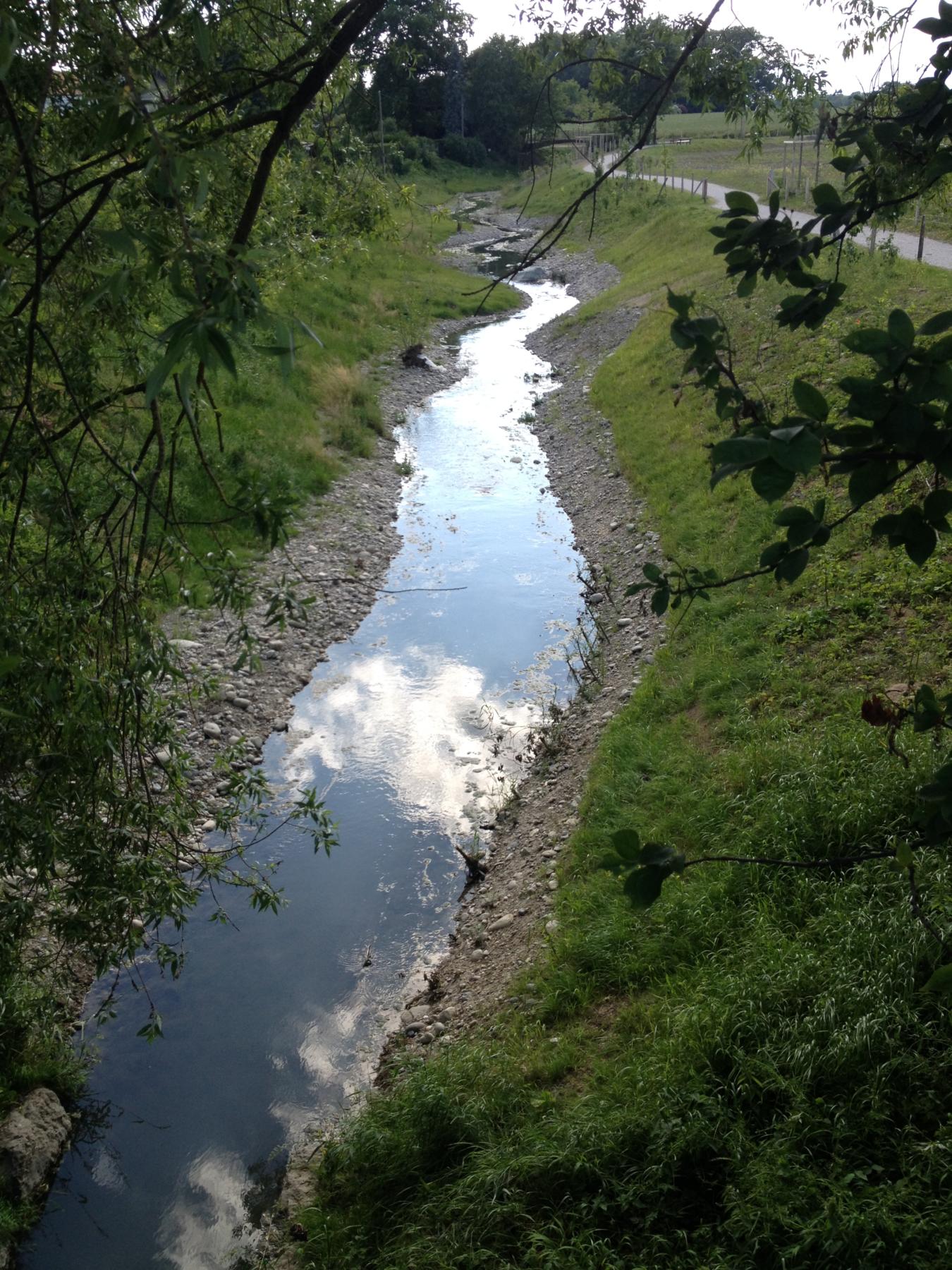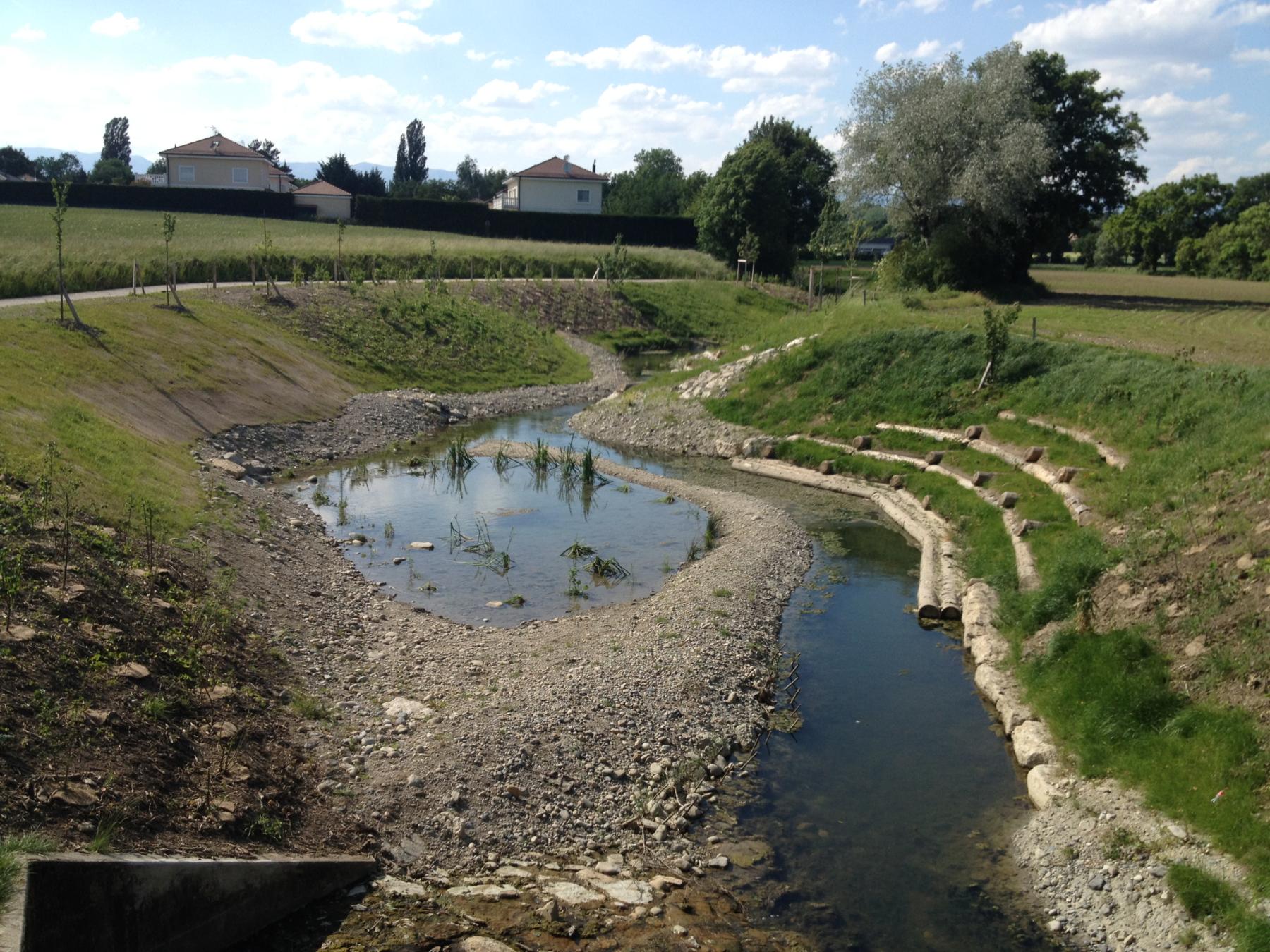 • Démolition de la cunette bétonnée, création d’un méandrage du cours d’eau afin de créer une bonne diversité des écoulements, création de zones humides annexes pour augmenter la biodiversité et créer des biotopes relais ;