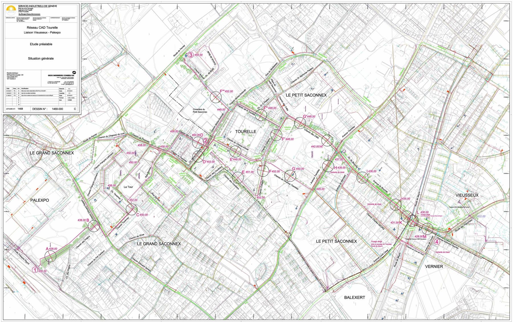 Etudier et définir le tracé optimal d’une liaison entre 2 réseaux de chauffage existants afin de créer une possibilité de bouclage et de permettre de raccorder plusieurs chaufferies importantes désireuses être reliées au réseau de chauffage à distance des Services Industriels de Genève.