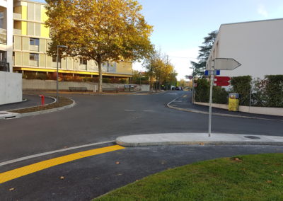 - Réaménagement de la chaussée (carrefour surélevé, passage pour piéton avec avancée de trottoir et place de stationnement devant les nouveaux immeubles)