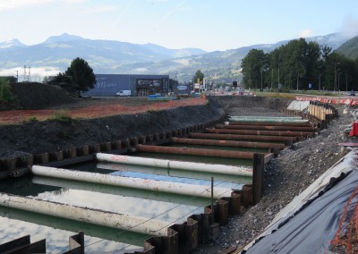La nappe phréatique étant située à faible profondeur et la perméabilité des terrains élevée (alluvions graveleuses de l’Arve), l’ouvrage nécessite la mise en œuvre d’un soutènement provisoire, de type palplanches, associé à un bouchon hydraulique en fond de fouille. L’ouvrage définitif est une tranchée ouverte cuvelée en béton avec en son milieu un pont rail.