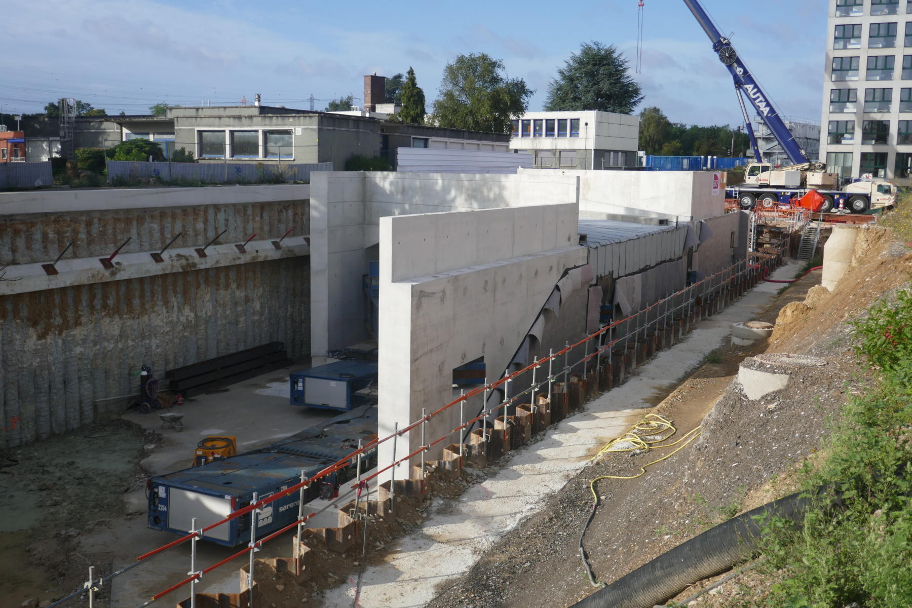 Dans le cadre de leur mission de supervision géotechnique de l’exécution (mission G4), les ingénieurs de GEOS ont vérifié la conformité des matériaux constituant le fond de fouille avant la mise en place de l’ouvrage à sa position finale et définitive. À la suite de la réception du fond de fouille, l’ouvrage a été ripé à l’aide de chariots automoteurs de type KAMAG, par l’entreprise Bouygues Travaux Publics, titulaire du marché Travaux.